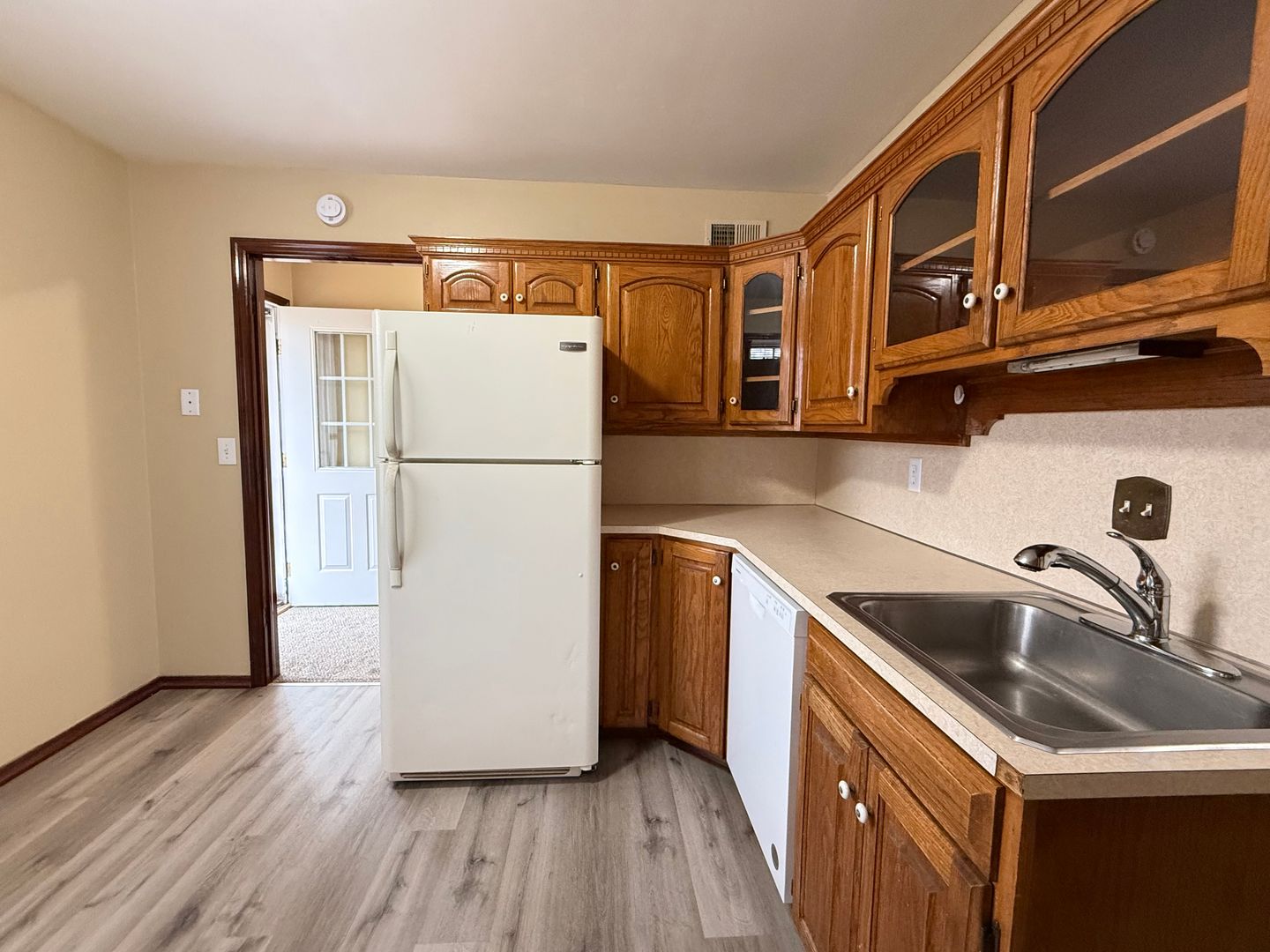 Warm wood cabinetry, trim, and doors throughout the home add character and a classic, built-to-last feel. The kitchen connects directly to the attached one-car garage with built-in shelving for everyday convenience. Outside, you’ll find a fully fenced backyard with garden beds and a small greenhouse, plus a driveway with room for additional parking.